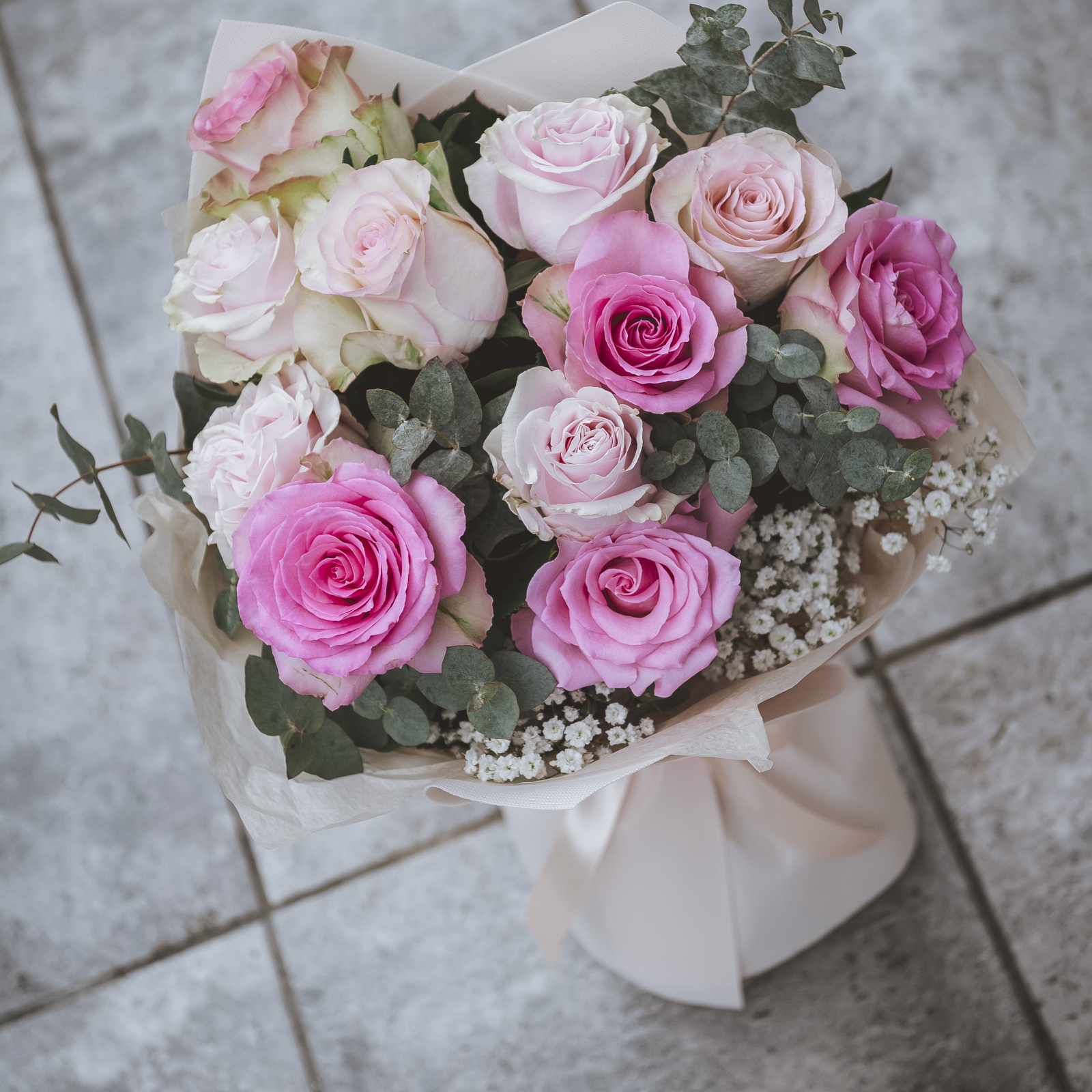 Un buchet elegant, delicat, compus din 11 trandafiri mix de rozuri, gypsophila și eucalypt.