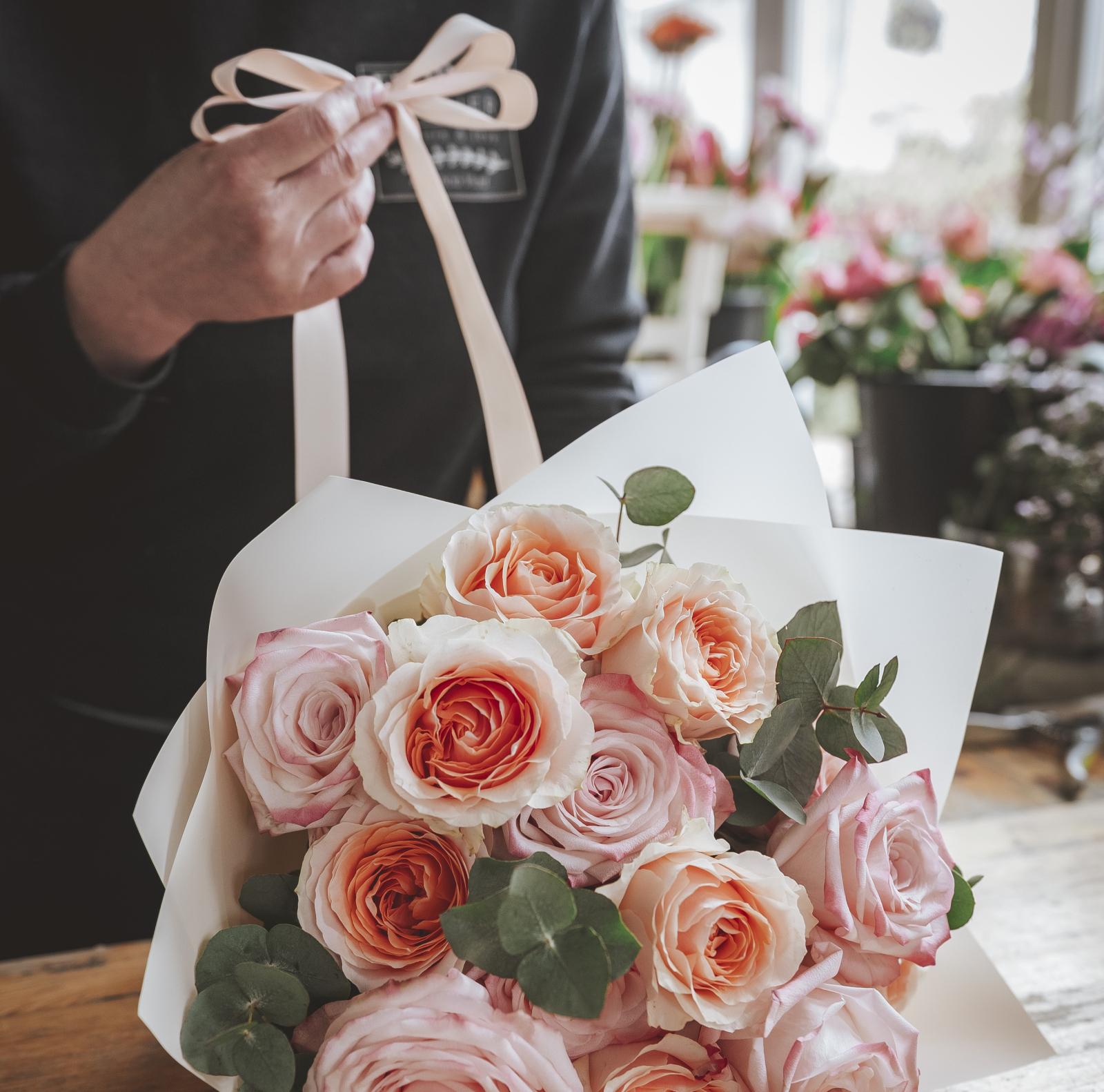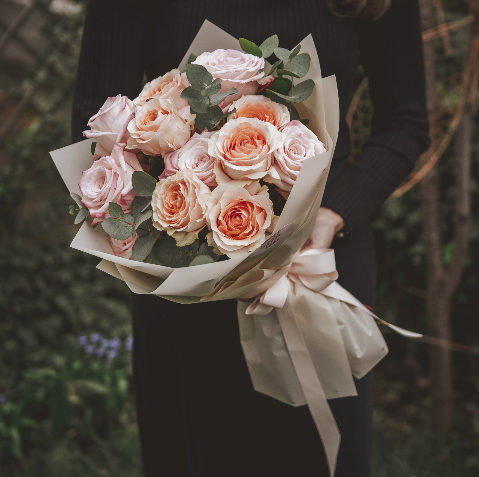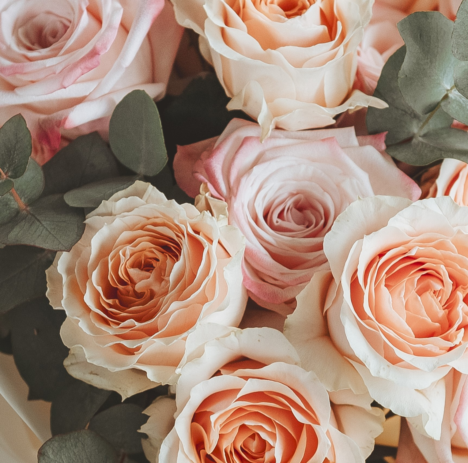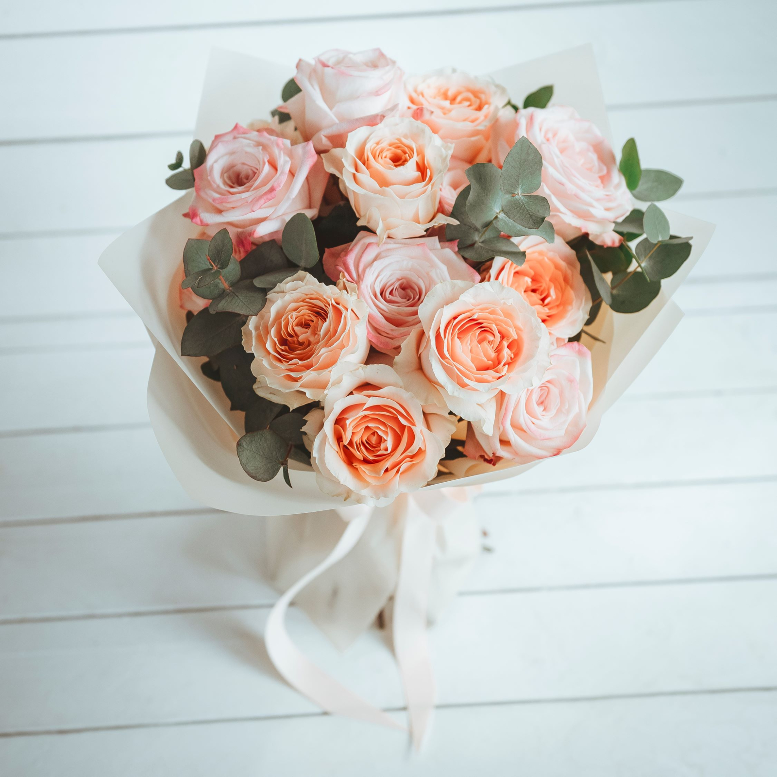 Buchet cu 15 trandafiri Roz/Peach, soiuri premium, parfumați, cu rezistență mare în vază. Cu Eucalipt.