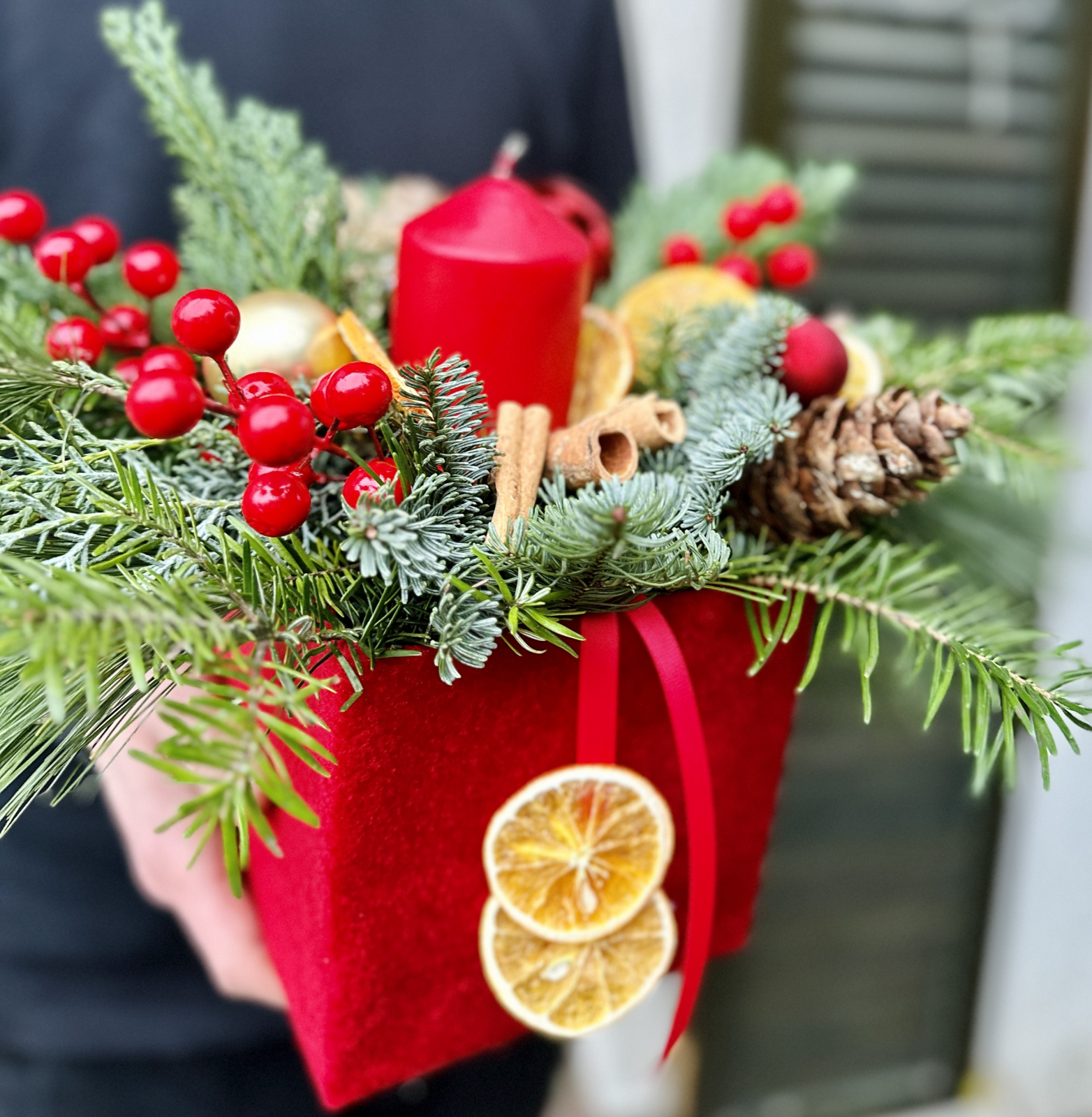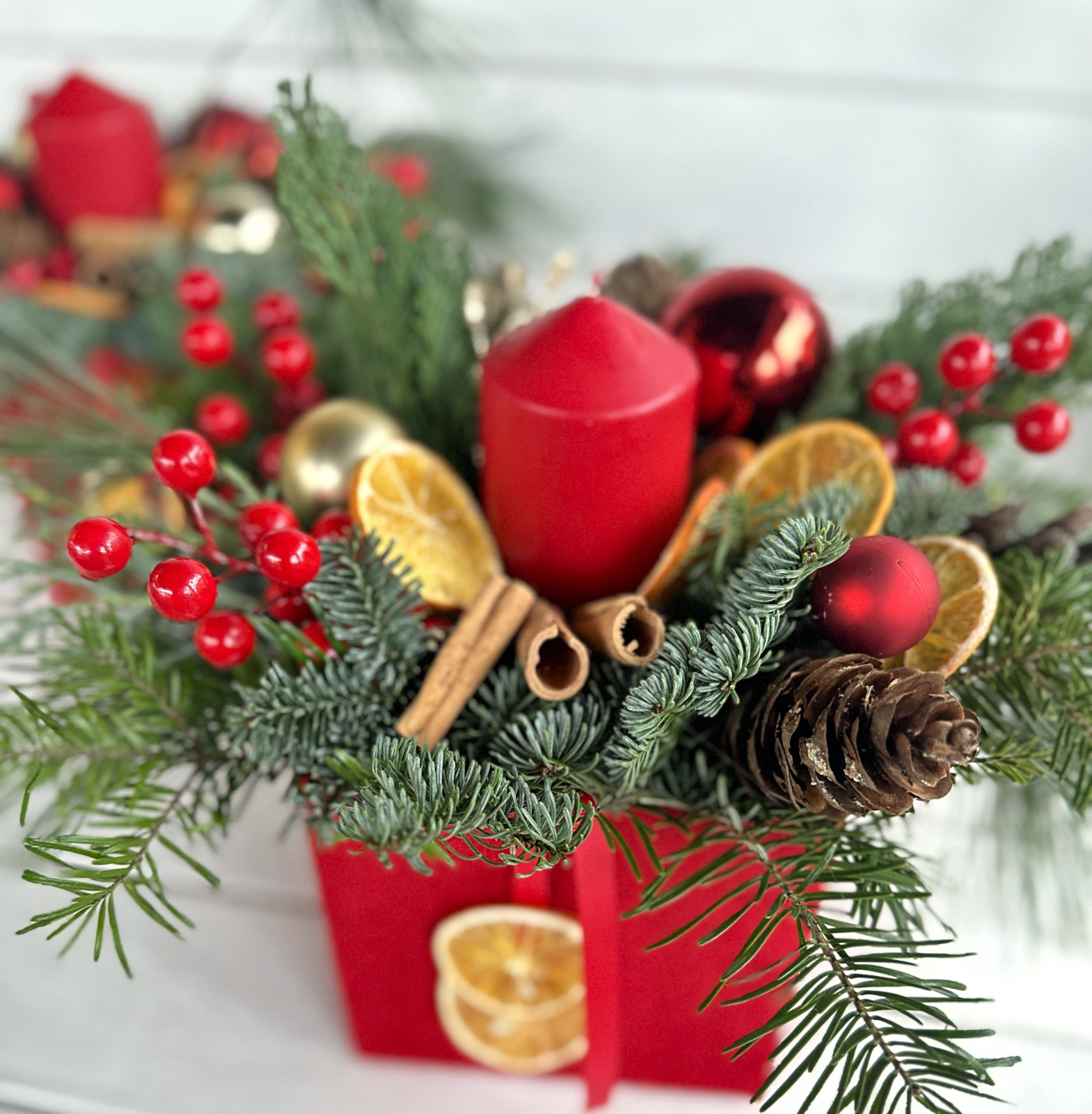 Decorațiune/cadou Crăciun. Cutie catifea roșie 14/14 cm, brad și mix de conifere fresh, lumânare stâlp roșie, decorațiuni specifice Crăciun - globuri, conuri brad, felii portocală, scorțișoară. Cromatică roșu/auriu